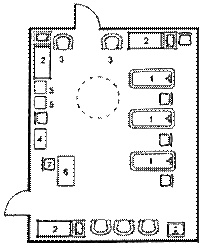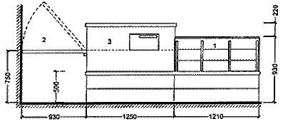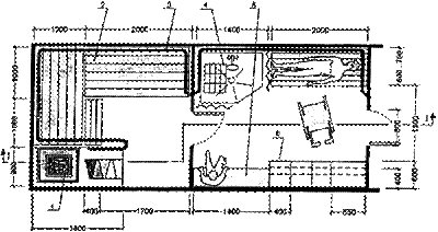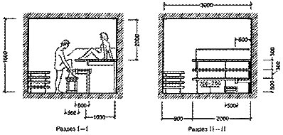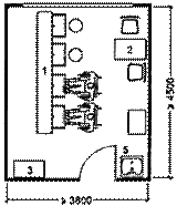 | 1 - витрина из стекла; 2 - прилавок, состоящий из откидной доски, служащей местом обслуживания инвалидов; 3 - прилавок для продавца с кассовым аппаратом; 4 - шкафы с товаром; 5 - кассовый аппарат | ||
