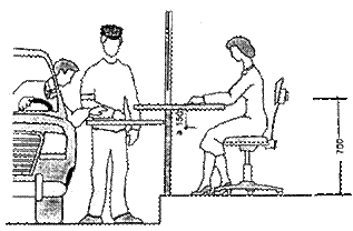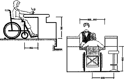 3 Операционные залы предприятий связи, переговорные пункты | 2.6 "Б" - в почтамтах рекомендуется наличие специализированных кабин в переговорных пунктах | 5.3 В отделе пенсионных выплат - локальное понижение прилавка; увеличение глубины и ширины прилавка со стороны клиента. | ||