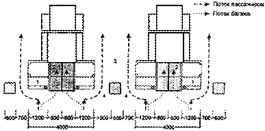 | 1 - зал выдачи багажа; 2, 3 - транспортеры; 4 - общие входы и выходы для пассажиров; 5 - проходы для инвалидов на колясках шириной 90 см |