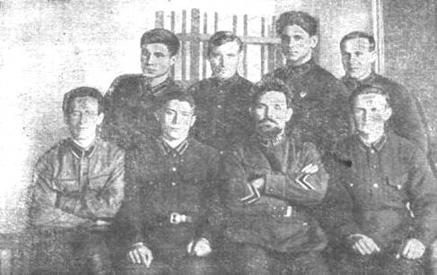 Слева направо сидят: Устьянцев — старший преподаватель физкультуры НИВИТа; С. Нагибин — комсорг лыжного перехода; Шишковский — зам. начальника института по военной подготовке; Е. Алексеев — командир перехода. Вверху: П. Евдокимов, В. Ханыгин, Л. Шлямин, И. Бородулин — участники перехода