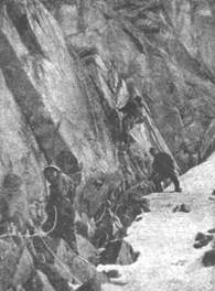 Первые двести метров обрабатывали несколько дней, каждый раз спускаясь в штурмовой лагерь. Такая тактика довольно распространена на сложных восхождениях. Основная цель обработки — навешивание веревок в трудных местах, чтобы можно было пролезть с рюкзаком, держась за нее, а не только за скальные выступы и вырубленные во льду карманы. Если же лазание очень трудное, то приходится лезть только по веревке, но не так, как по канату в спортзале, а с помощью специальных зажимов, к которым прикрепляются веревочные петли для ног. Эти зажимы — «жумары» (франц.) — легко передвигаются вверх по веревке, но намертво схватывают при натяжении вниз. При подъеме по отвесным скалам такая техника позволяет избежать ненужных потерь сил и времени. Часто подниматься приходится без рюкзака, вытягивая его затем на веревке. Веревка навешивается первым— на его долю выпадает наиболее ответственная часть работы. Мало того, что нужно пролезть там, где друзья «пойдут» по веревке, нужно еще «обработать» маршрут — найти трещины в скалах и забить в них через каждые три, пять, а то и один метр скальные крючья.