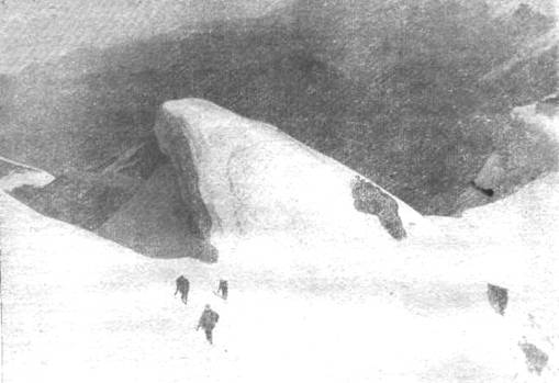 Дальше путь на запад. Спускаемся в широкий кулуар, попадаем на осыпь, лежащую на снегу, и здесь впервые за все восхождение видим воду. С наслаждением пьем. Рубим ступени на ледовом склоне... И попадаем на очень узкий, сплошь обледенелый участок гребня... Странное это хождение: осторожно ступаешь левой ногой по одному боку ледяного ножа, правой по другому, опираешься кое-как ледорубом и судорожно следишь за веревкой, соединяющей тебя с товарищем по связке. Нервы, слух, зрение — все напряжено до предела, и до предела натянута незримая нить, крепче веревки соединяющая двух людей, — чувство поддержки.