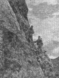 ...Под прикрытием скалы негромко шумит примус. Двумя метрами ниже на скальном балконе примостилась наша палатка. Выше меня Леня Калужский и Гриша Каспирович готовят маршрут на завтра — проходят очень сложный участок. В палатке готовятся ко сну мои товарищи по восхождению: Володя Терещенко, Валерий Карев и Лев Цыбкин. Сегодня у нас был трудный день...