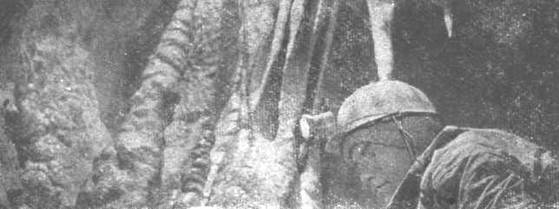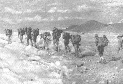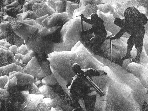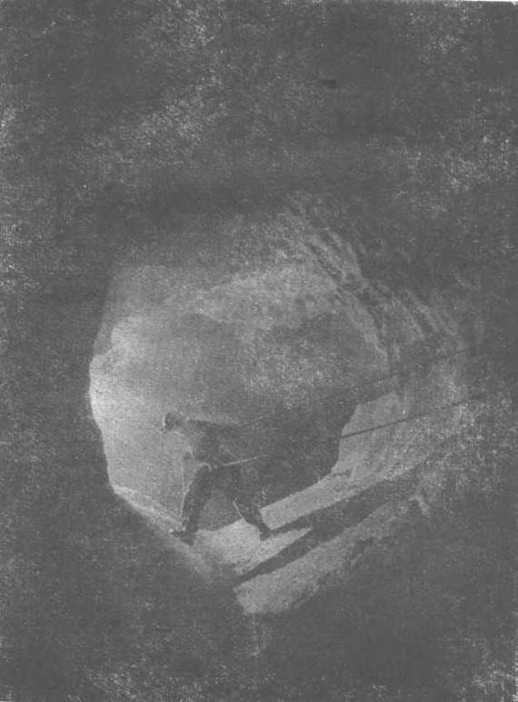 ...Сегодня пойдем рано утром. Через час группа уже начинает движение к внутреннему углу, в котором еще вчера повешена 12-метровая лесенка. И тут начинается своеобразная эквилибристика: надо лезть вверх, но тяжелый рюкзак тянет вниз, мешают ледоруб и веревка, к которой пристегнут для страховки, плюс собственный вес и еще каска, которая в самый неподходящий момент сползает то на нос, то на затылок. В такие моменты очень хочется иметь третью руку, но за неимением ее часто выручают зубы. Медленно поднимаюсь вверх по лесенке. Леня Калужский, который уже прошел этот путь, подбадривает: «Давай, давай! Кого ждешь?» «Дай отдохнуть!» «Некогда, внизу еще много народу, да и впереди не сахар, давай ко мне!». Что делать, давай, так давай. Ступенька, еще ступенька! А, черт побери, опять веревка мешает. «Эй, внизу! Натяни перильную веревку! Вот так, хорошо!».