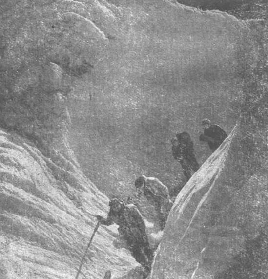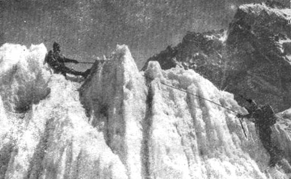Уже часа три мы трудимся в тумане. Где-то недалеко, за облаками между двумя вершинами прячься солнце... Оно могло бы и погреть нас! Одежда заледенела, а веревки похожи на стальные буксировочные тросы. Совсем близко должна быть перемычка, на которой можно передохнуть после одиннадцатичасовой работы. Двое проходят бергшрунд и начинают подъем к перемычке. Снег крутой и ненадежный, ступеньки в нем получаются мелкие, и страховка через ледоруб ненадежна. Игорь идет, взяв в каждую руку по ледорубу. Получается снежное лазание.