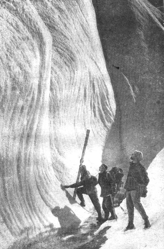 Медленно, от крюка до крюка двигается последний в группе. Ему и хорошо, и плохо. Ясно, что в трудный момент его подтянут на веревке друзья, но ведь ему же и крючья нужно выбивать на отвесной стене. Видимо, придется сделать так: выстегнуть веревку из карабина, нотами упереться в скалу, откинуться — и бить молотком по крюку. Два удара вверх, два удара вниз. Теперь потянем рукой. Нет, не идет. Повторим еще раз... Так, теперь хорошо. Пристегнул крюк с карабином к поясу. Выбери веревку, пошел! За головой все время летят осколки льда. чистит скалы вверху. Хорошо, когда над головой голубое небо...