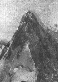 Ночь была тревожной. По желобам, идущим со склонов северной вершины, то и дело грохотали лавины. Проносились они в такой непосредственной близости от нас, что создавалось впечатление, будто сидим мы не на снежной полке горы, а в металлическом ящике под железнодорожным полотном, и по рельсам несутся большегрузные товарные поезда. В одиннадцатом часу утра Игорь Мешков предложил начать все-таки обработку обхода жандарма, а мне поручается наведение уюта в палатке и приготовление еды. Пытаюсь разложить намокшие мешки, открываю вход и вентиляционное окошко, зажигаю в палатке примус. Хорошо бы просушить серебристый инструкторский плащ, взятый нами на случай раздельной ночевки связок. Он похож на офицерскую плащ-накидку, но сшит из легкого непромокаемого перкаля. Расстилаю его по коньку палатки и слежу за ребятами. Позже мы обнаружили пропажу плаща: он улетел по склону вниз. Ох, и пошутили ребята над незадачливым «домохозяином», упустившим «большую серебристую птицу!» К вечеру все наши веревки (160 м) растянулись по пути обхода жандарма — таким будет наш дальнейший путь...