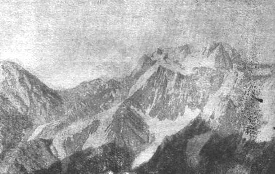 Прогрохотал «железнодорожный состав» льда... Где-то на нашем уровне или чуть ниже глыбища льда задела выступ стены: все потонуло в облаке ледяной пыли: ни солнца, ни стены над нами, ни гребня, уходящего круто вниз... Пока глотали кристаллическую пыль, созрело решение — нужно рубиться строго вверх, через второй,— еще никем не пройденный, — серый пояс под нависающую стенку.