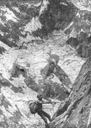 ...Карниз прорубали почти час. Вначале Володя Прокопенко забил крюк в скальный островок, потом вогнал по головку в снег свой айсбайль и попросил мой. На меня посыпались комки снега, льда, и в карнизе начало потихоньку расти окно. Ребята тем временем подтягивались по кулуару, прикрываясь у скал от «артобстрела»: льдинки* падая, сбивали камни. Наконец, плавно выжимаясь на двух ледорубах, Володя переваливается через карниз. За ним широкая перемычка и... крюк с петлей! Репшнур явно польский — здесь спускался Завада.