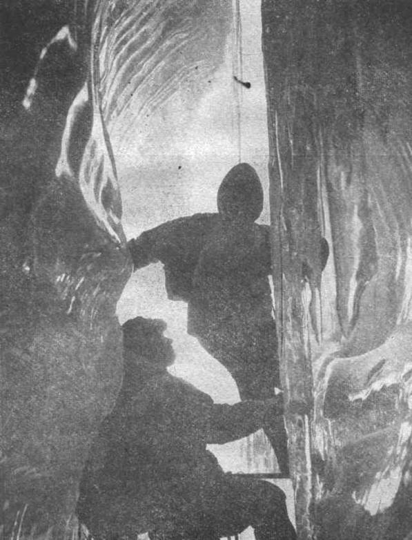 В этом году в первый день выдержали график Романова (их было шестеро, нас — восемь). На второй — чуть ушли вперед. Вырабатывали тактику прохождения: разбились на две четверки — одна во главе с Л. Калужским метр за метром, веревка за веревкой шла впереди, на плечи второй легла ответственность за бесперебойность снабжения первых двух связок веревками, крючьями, карабинами и, конечно, советами (здесь руководитель А. Серьезнов, капитан команды). На третий день опередили график уже на полдня. Но вот и плата за это: удобной площадки для бивака не нашли, устраивались в разных местах — одна четверка врубилась в заплывший льдом горизонтальный отщеп стены, другая примостилась на стыке льда и окал. Снаряжение максимально облегчено: на каждую четверку по «памирке», примусу, кастрюле, по два спальных мешка. На неудобной площадке и ночевка — не отдых...