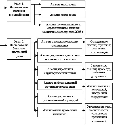 В работе проведен анализ основных концепций, представленных в теории организационных изменений, по признакам содержательных аспектов изменений и последовательности их проведения. К этим элементам относятся: осознание необходимости изменений, определение целей и задач изменений; поддержка изменений руководством; сбор информации; информирование и привлечение персонала; пилотное внедрение; преодоление сопротивления персонала и стимулирование желаемого поведения; привлечение внешних консультантов.