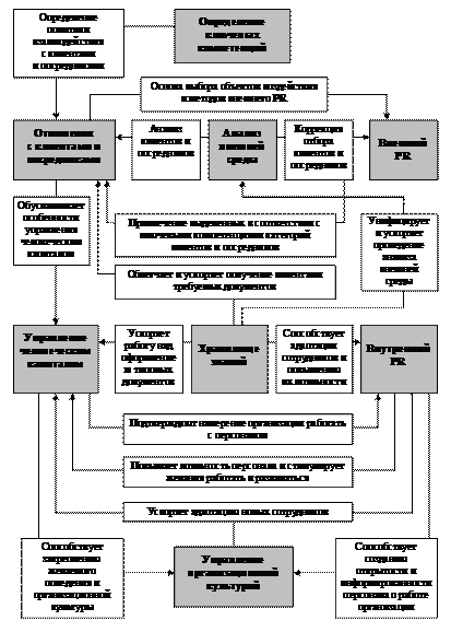 В первую очередь механизм обеспечения адаптивности предполагает определение ключевых компетенций организации. В диссертации понятие «ключевые компетенции» определено как набор взаимосвязанных навыков и технологий, позволяющих организации предоставлять своим клиентам существенную выгоду. Ключевые компетенции являются стратегическим преимуществом и позволяют выделиться на фоне других подобных организаций. Выявление присущих организации ключевых компетенций формирует соответствующую внешнюю политику. Внешняя политика включает отношения с покупателями и посредниками, проведение анализа внешней среды и мероприятий по привлечению клиентов (внешние связи с общественностью). Особенности внешней политики влияют на разработку внутренней политики организации, состоящей из управления человеческим капиталом, создания хранилища знаний и мероприятий по созданию лояльности персонала (внутренние связи с общественностью). Изменение внешней и внутренней политики в соответствии с ключевыми компетенциями позволит обосновать решение таких вопросов как определение направлений работы с клиентами, выбор посредников, создание рекламных и информационных сообщений, содержание функций работы с персоналом и ряда других.