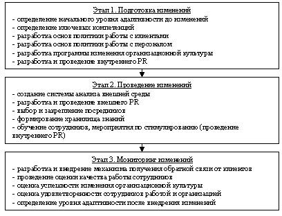 На первом, подготовительном этапе рекомендуется оценить уровень адаптивности для осуществления его дальнейшего мониторинга и контроля качества проводимых изменений и разработать основные элементы внешней и внутренней политики, исходя из выбора ключевых компетенций. Также, важным моментом является проведение внутреннего PR для снижения напряженности сотрудников. На втором этапе определяются инструменты механизма, призванные обеспечить наиболее оптимальное формирование и поддержание основных элементов (а именно, работы с клиентами и персоналом). На третьем этапе автор рекомендует определить систему оценки результатов работы сотрудников и провести оценку уровня адаптивности.