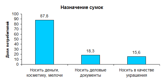 По результатам исследования (диаграмма ниже), большинство потребителей (около 88%) используют женские сумки для того, чтобы носить деньги, косметику и различные мелочи. Около 18% женщин используют сумочки для ношения деловых документов. Приблизительно такая же доля потребителей (16%) используют женскую сумку в качестве детали туалета и для украшения.