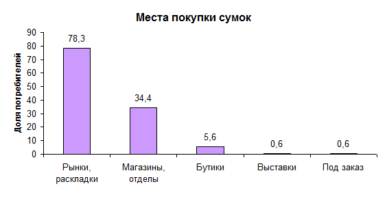 Около трети женщин (34%) покупают сумки в специализированных магазинах либо отделах кожгалантереи в крупных универмагах и торговых центрах, а 6% женщин выбирают сумки в модных бутиках. Таким образом, около 40% потребителей склонны покупать сумки в «цивилизованных местах продажи».