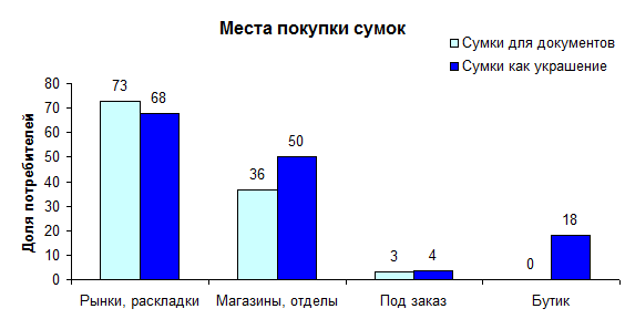 Сумки для украшения, по сравнению с сумками для документов, потребители чаще покупают в цивилизованных местах продаж – бутиках и магазинах (около 68% на диаграмме ниже), и немного реже на рынках.