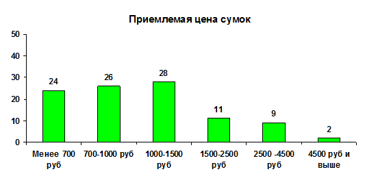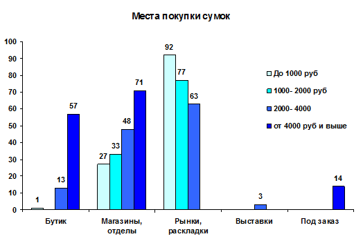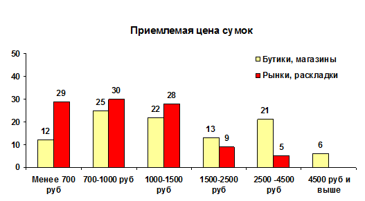 Расчет средней цены по сегментам показывает, что на рынках приемлемая средняя стоимость сумки составляет около 1000 руб., в то время как в магазинах, универмагах и модных бутиках – около 1800 руб.