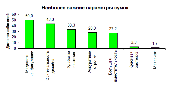Можно сказать, что в целом марочное название не является ключевым параметром выбора сумки – большинство потребителей выбирают товар, исходя из восприятия его качественных параметров.