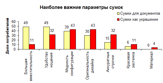 Иначе распределились приоритеты потребителей относительно параметров качества сумок в зависимости от их предназначения. Так наиболее важными параметрами сумок для документов является их вместительность и удобство для ношения. Однако параметры качества сумок, покупаемых для украшения, незначительно отличаются от общего показателя.