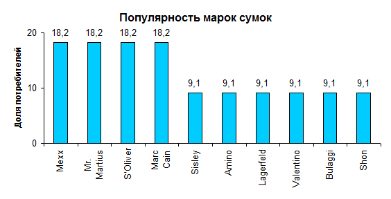 Среди тех же потребителей, которые смогли назвать марки используемых сумок, по два раза были названы марки: Mexx, Mr. Martius, S’Oliver, Marc Cain и по одному человеку указали марки Sisley, Amino, Lagerfeld, Valentino, Bulaggi, Shon (все названия представлены так, как их называли потребители).
