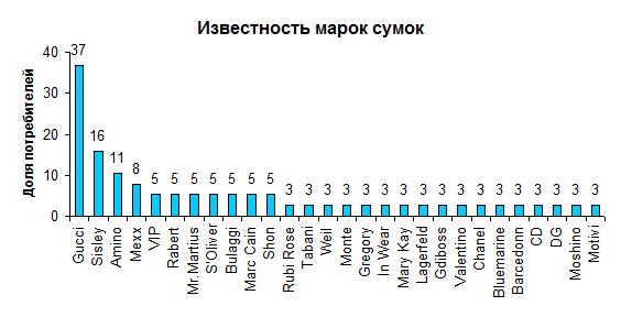 Среди женщин, которые более или менее ориентируются в марочных названиях сумок, наибольшей известностью пользуются следующие марки: Gucci (известность - 38% среди тех, кто знает марки и около 8% среди всех женщин), Sisley (16% и 3,5% соответственно), Amino (11% и 2,5%) и Мехх (8% и 1,7%). Менее известны сумки прочих марок, представленных на диаграмме ниже (марки названы 1-2 женщинами).