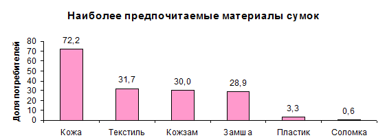 Диаграмма ниже показывает, что больше всего, около 72% женщин, предпочитают носить кожаные сумки. Около трети потребителей предпочитают сумки из замши, текстиля и заменителя кожи. Не более 5% женщин хотели бы иметь сумку из пластика. Есть также небольшая категория потребителей (не более 3%), предпочитающих «соломенные» сумки), которые пользуются некоторой популярностью в этом летнем сезоне.