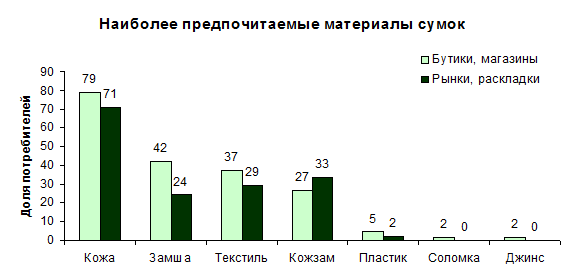 При более детальном рассмотрении мотиваций потребителей, покупающих сумки в различных местах (диаграмма ниже), выясняется, что в цивилизованны местах продаж в большей степени, чем на рынках популярны кожа, текстиль и особенно – замша. Сумки из кожзаменителя имеют почти одинаковую популярность (у трети потребителей) как на рынках, так и в магазинах и бутиках.