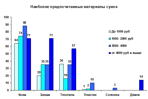 Следующая диаграмма показывает, что с возрастанием цены предпочтение сумок из кожи, текстиля и особенно замши в общем, значительно увеличивается, в то время, как популярность кожзаменителя заметно падает. Наиболее дорогие сумки могут привлекать женщин и оригинальностью материала (пластик, соломка, джинс).