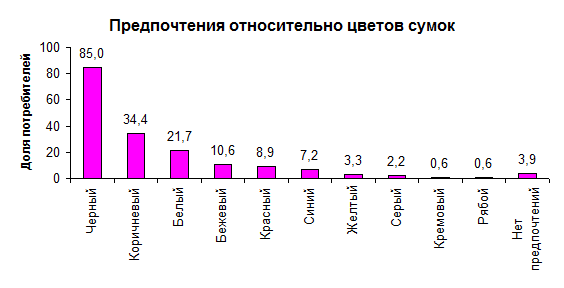 Подавляющее большинство женщин (около 85%), как показано на диаграмме ниже, предпочитают сумки черного цвета. Вторым по популярности является коричневый цвет – его предпочитает около трети потребителей. Пятой части нравятся белые сумки. Приблизительно десятую часть женщин привлекают сумки синего, бежевого и красного цвета. Остальные представленные на диаграмме цвета сумок менее популярны. Около 4% потребителей не имеют четких предпочтений.