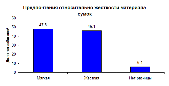 Из диаграммы ниже видно, что приблизительно одинаковое количество (около 46-48% потребителей) отдают предпочтение как сумкам из мягкого материала, принимающего любую форму, так и сумкам из жесткого материала или с каркасом, имеющих четкую форму.