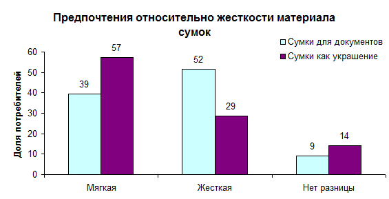Диаграмма ниже показывает: несмотря на то, что в общем, женщины почти одинаково предпочитают мягкие и жесткие сумки, для документов они чаще выбирают сумки из жесткого материала или с каркасом, украшающие же сумки предпочитают мягкие и эластичные, принимающие любую форму.