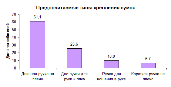 Диаграмма выше показывает, что среди потребителей женских сумок большинство (около 68%) предпочитают носить сумки только на плече. Из них около 61% предпочитают длинную, а около 7% - короткую ручку для плеча. Около четверти потребителей хотели бы носить сумку, как на плече, так и в руках, для чего необходимы две соответствующие ручки. Около 10% предпочитают, чтобы к сумочке была прикреплена только ручка для ношения в руках.