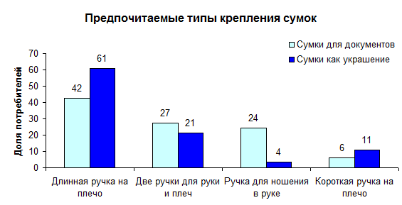Предпочтения потребителей изменяются в зависимости от места покупки сумки и ее цены. Так, покупая сумки в цивилизованных местах (магазины и бутики), всего 11% женщин предпочитают крепление с двумя ручками для руки и плеч против 28% женщин, покупающих на рынках. Подобная зависимость проявляется и для сумок из различных ценовых категорий: чем дороже сумка, тем реже ее покупатели выбирают крепление с двумя ручками. По остальным вариантам крепления различия между ценовыми сегментами незначительны.