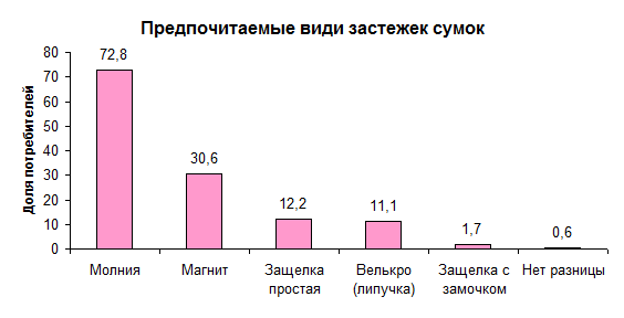 Нужно заметить, что защелки типа «молния» и «магнит» еще более предпочитаемы в сумках, используемых в качестве украшения (предпочитают соответственно 82% и 43% женщин).