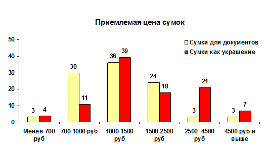 Характерным в распределении потребителей относительно приемлемой цены является то, что сумки для украшения женщины согласны покупать по более высоким ценам (средняя цена - около 1800 руб.), чем сумки для документов (средняя цена – около 1200 руб.). Почти треть покупателей сумок для украшения согласны платить за них более 2500 руб., около 7% - более 4500 рублей. Графически данные отличия представлены ниже.