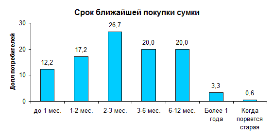 Диаграмма, приведенная выше, указывает на то, что около четверти потребителей собираются покупать новую сумку не раньше, чем через 6-12 месяцев. Около пятой части женщин наметили покупку новой сумки в ближайшие 3-6 месяцев. Доля потребителей, собирающихся покупать новую сумку в ближайший месяц и в ближайшие 2 и 3 месяца составляет около 66% (две трети) – это, скорее всего, объясняется сезонной спецификой (многие склонны купить на лето новую сумку).