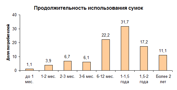 Более 1,5 лет сумку используют около 28%. В течение 1-2 месяцев от сумки избавляются не более 7,5% потребителей.