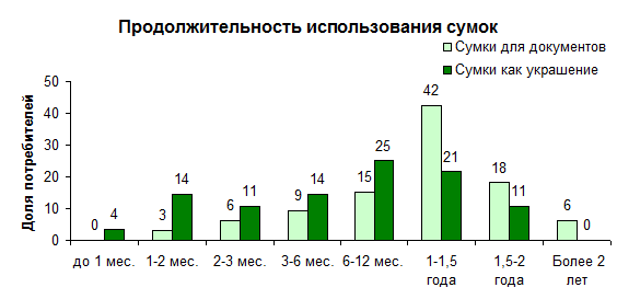 Продолжительность использования сумок отличается в зависимости от предназначения сумки. Так не более 20% потребителей деловых сумок для документов меняют их чаще раза в 6 месяцев. За те же 6 месяцев женщины меняют до 45% сумок для украшения. Наглядно различие продолжительности использования сумок для документов и украшения представлено на диаграмме ниже.