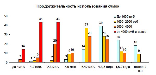 Сумки стоимостью до 1000 руб. чаще всего покупаются на 1-2 года, стоимостью от 1000 до 2000 руб. – на 6-12 месяцев, и дорогие сумки (дороже 4000 руб.), служат не дольше 3 месяцев.