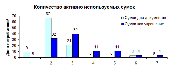 Если количество одновременно используемых сумок для документов значительно не отличается от среднего показателя (чаще всего используется 2 сумки одновременно), то использование сумок в качестве украшения подчиняется другой зависимости (см. диаграмму ниже).