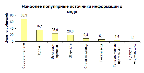 Подавляющее большинство потребителей (около 70%) самостоятельно изучают предложение на рынке (смотрят то, что есть на прилавках), третья часть узнает о новинках моды от подруг. Третье место (четвертая – пятая часть потребителей) узнают по выставкам-ярмаркам и из журналов.