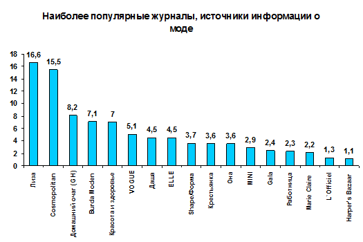 Основным источником информации о моде является Лиза, на втором месте – Космо и Домашний очаг, остальные представленные на диаграмме журналы менее популярны.
