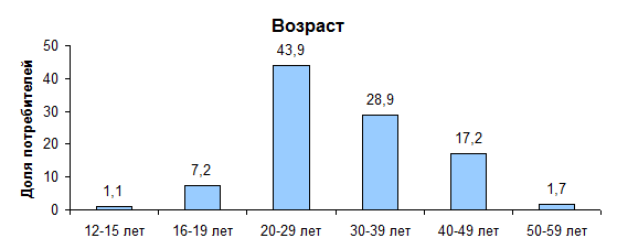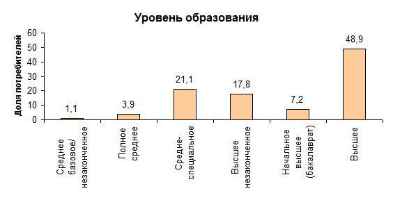 На представленной ниже диаграмме видно, что около половины потребителей имеют высшее образование, около пятой части – средне-специальное и высшее незаконченное.