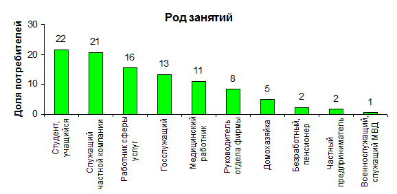 Распределение по роду занятий также очень схоже со средними показателями: около 22% приходится на служащих частных предприятий и студентов/учащихся. Далее около 15% - госслужащие и работники сферы услуг, около 10% - медицинских работников и руководителей среднего звена, около 5% - домохозяйки.