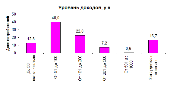 Как видно, около половины потребителей можно отнести к категории дохода «ниже среднего» (это схоже с результатами многих исследований). Не менее четвертой части имеют средний доход (100-500 у. е. на человека в семье). В то же время, значительное количество людей (около 17%) затрудняются назвать свой доход или скрывают его.