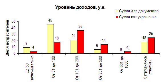 Однако женщины, покупающие сумки в качестве украшения, характеризируются более высокими доходами (около 50% имеют средний доход – от 100 до 1000 у. е. в месяц на человека в семье). Более высокий процент людей (около четверти) затрудняются назвать свой доход или скрывают его.