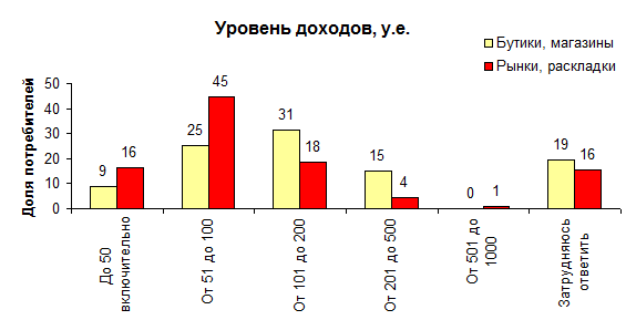 Из диаграммы ниже следует, что покупатели сумок на рынках имеют более низкие доходы, чем покупатели бутиков и магазинов. Так, около половины женщин, покупающих сумки на рынках, можно отнести к категории дохода «ниже среднего», в то время как среди покупающих сумки в цивилизованных местах эта доля составляет лишь около 34%. Не более 28% покупателей на рынках характеризируются средним доходом (у. е. на человека в семье) и не менее 40% - среди покупателей магазинов и бутиков.