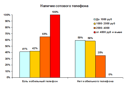 Из диаграммы ниже следует, что женщины, покупающие дорогие сумки более часто пользуются мобильными телефонами, чем покупающие сумки подешевле. Так среди потребителей сумок стоимостью до 1500 руб. мобильные телефоны используют до половины женщин. Среди покупателей сумок ценового диапазона руб. доля пользующихся мобильными возрастает до 65%. И практически все женщины, покупающие дорогие сумки (4000 руб. и выше), используют мобильный телефон.