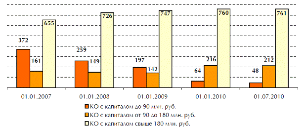В ближайшие годы можно ожидать дальнейшего сокращения числа кредитных организаций. Прежде всего, это будет связано с тем, что с 2012 г. вступит в действие требование о повышении минимальной величины собственных средств действующих кредитных организаций до 180 млн. рублей. В настоящее время в стране действуют 212 банков с капиталом от 90 до 180 млн. рублей, которые будут поставлены перед необходимостью либо увеличения капитала, хотя это может и не диктоваться экономическими обстоятельствами, либо реорганизации или присоединения к другому банку (рисунок 3).