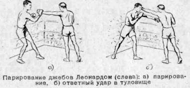 Леонард эффективно демонстрировал в своих матчах специально разработанную им против джебов защиту. Когда он замечал, что противник слишком часто досаждает ему джебами, он специально мобилизовал свою правую ладонь для парирования их, держа её раскрытой у подбородка. Каждый раз, когда левая рука противника приближалась к его лицу, он резким и коротким движением отталкивал её от себя влево, производя при этом толкающее скользящее лишение по наружной стороне предплечья руки противника. В этой защите он достиг такого совершенства, что его правая ладонь автоматически, точно и без усилия выполняла это движение, возвращаясь после каждого толчка в исходное положение. Если противник наносил прямой удар с силой, то парирование Леонарда выводило его из равновесия. При удачном парировании прямого удара, Леонард, используя промах противника, немедленно переходил в контратаку, начиная её с левой руки.